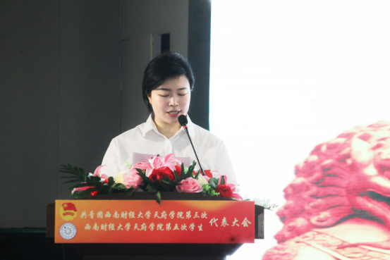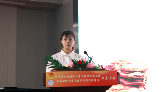 由陈洁同学代表西南财经大学天府学院第四届学生会作《永远跟党走 奋进新征程 建功新时代 充分发挥桥梁纽带作用 贡献青春力量 书写青春荣光》学生会工作报告。报告全面总结了过去一年校学生会工作所取得的成绩和积累的经验,并对下一年度学生会工作的目标任务与实施计划进行了说明。