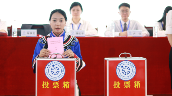 下午,第二次全体会议在学术报告厅召开,大会通过关于团委、学生会工作报告的决议,通过修订后的《西南财经大学天府学院学生会章程》,根据《共青团西南财经大学天府学院第三次代表大会暨西南财经大学天府学院第五次学生代表大会选举办法》,经全体代表酝酿和主席团会议审议,共确定了23名第三届团委委员候选人,22名第五届学生委员会委员候选人,通过大会总监票人、总计票人、监票人、计票人名单,大会开始选举环节。
