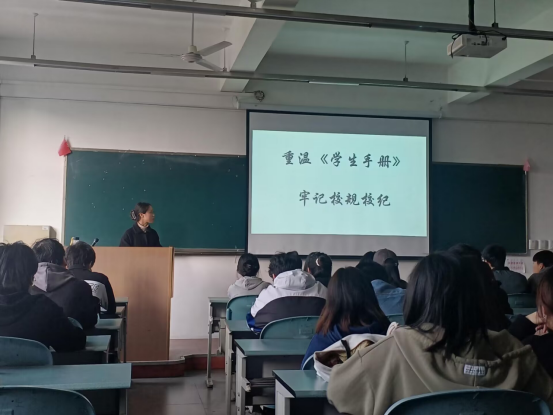近日,学校再次开展了重温《学生手册》的活动,本次主要以班级为单位,采用班会课的形式,放映演示PPT,由各班班长为大家讲解学生手册。其中主要包括学生行为规范细则、第二课堂、奖惩制度、考试规则、学生违纪处分规定、违规电器和图书馆等方面的内容。在此次活动中,学校各二级学院辅导员也呼吁大家认真研读学生手册的各个内容,对学校处理违纪违规行为的规定烂熟于心并时刻牢记。